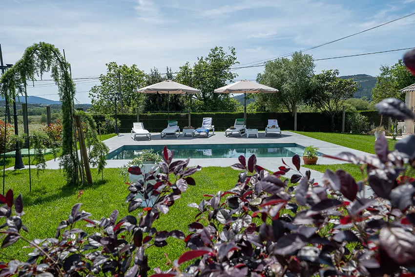 Rodeada de verde y silencio, nuestra piscina es una lámina de agua turquesa que te invita a soltarlo todo. No es una piscina para hacer largos, es una piscina para deshacer nudos.